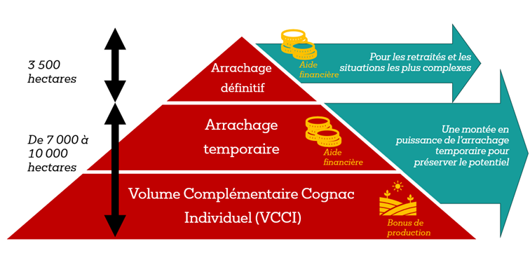 Le deuxième niveau, formalisé au sein d’une demande adressée au ministère de l’Agriculture, concerne un dispositif arrachage temporaire ne donnant cette fois pas droit à un volume complémentaire de production, mais à une compensation financière. L’estimation actuelle porte sur 7 000 à 10 000 hectares potentiellement concernés, à la fois par le VCCI et cet arrachage temporaire aidé.