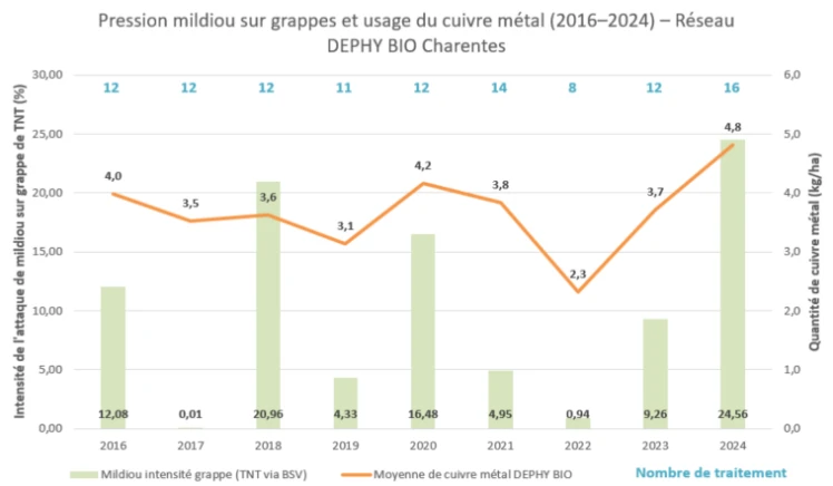 En moyenne depuis 2016, le réseau applique 3,68 kg/ha de cuivre métal, pour 12 traitements et un rendement d’environ 9 hl AP/ha. Les années humides et chaudes compliquent la tâche, avec des pluies fréquentes lessivant rapidement les produits de contact et limitant les fenêtres de traitement. C’est le cas en 2020, 2021 et surtout en 2024 : 4,82 kg/ha de cuivre métal, 16 traitements, des symptômes de mildiou sur 70 % des organes (avec 16 % d’intensité sur feuille et 23 % sur grappe) et un rendement moyen de 5 hl AP/ha (soit –50 % par rapport à 2023).