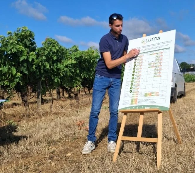 Limiter l’utilisation des produits phytopharMaceutiques selon les principes de l’Agroécologie LUMA, c’est un réseau de 24 parcelles suivies de façon hebdomadaire pour caractériser le risque et les éventuels dégâts afin d’affiner une prescription de traitement (assurée par le BNIC, l’IFV et les Chambres d’Agriculture de Charente et CharenteMaritime/Deux-Sèvres). Cette prescription s’appuie sur la pression des maladies cryptogamiques issues des réseaux des TNT (Témoins Non Traités), sur la modélisation (DECITRAIT® de l’IFV), et sur la rémanence des produits employés. Les produits proposés ne concernent que des spécialités avec AMM, sans DSR et avec une ZNT de 5 m. Chaque parcelle est divisée en deux modalités de 10 rangs de 50 m minimum : - Modalité LUMA traitée par des produits de biocontrôle et/ou utilisables en agriculture biologique (Cuivre) - Modalité REF traitée selon la stratégie de protection classique de l’exploitation.
